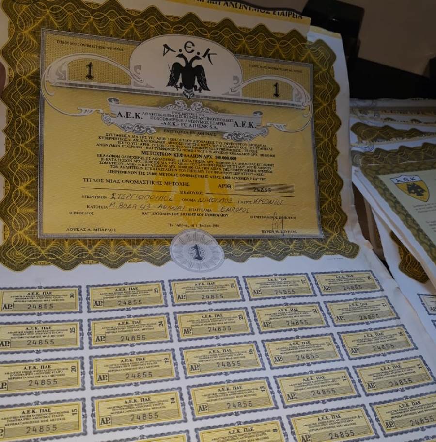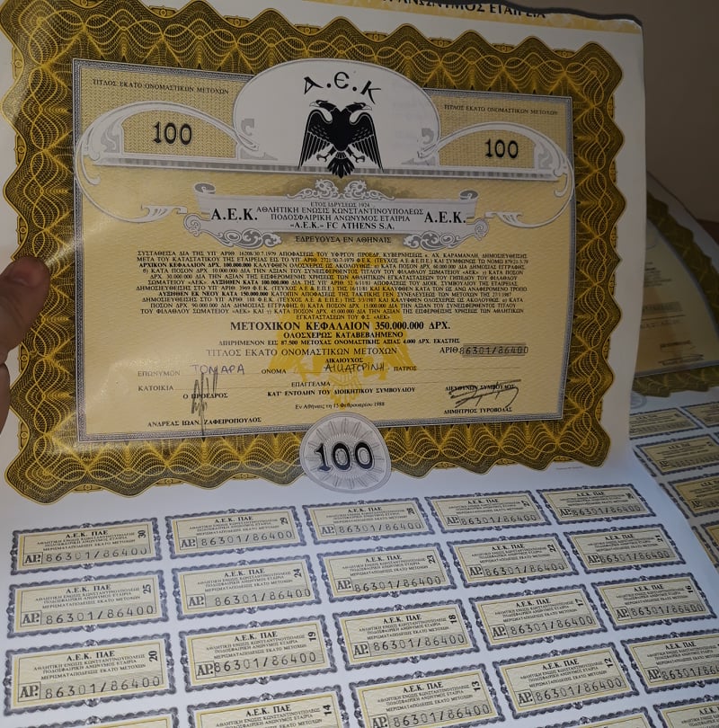 Αφορμή του σημερινού κειμένου ήταν η πρόσφατη απόκτηση 6 σωμάτων μετοχών της πρώην Π.Α.Ε. Α.Ε.Κ. Οι ονομαστικές αυτές μετοχές αυτές καλύπτουν 5 Αυξήσεις Μετοχικού Κεφαλαίου, τις οποίες και θα σχολιάσω μέσα από το Καταστατικό της (βλέπε εδώ). Μέσω των σωμάτων των μετοχών ο νους των μεγαλύτερων σε ηλικία θα γυρίσει πίσω στον χρόνο, ενώ για τους νεότερους καλό θα ήταν ν’ αποτελέσει έναυσμα για να ψάξουν το (μετοχικό και όχι μόνο) παρελθόν της Α.Ε.Κ. Ανεξάρτητα, όμως, από την εντρύφηση στο παρελθόν της Α.Ε.Κ. τα σώματα των μετοχών έχουν μια υψηλή αισθητική αξία, την ίδια στιγμή που η ιστορική τους αξία προσδιορίζεται σε κάποιες περιπτώσεις από τις υπογραφές που φέρουν.