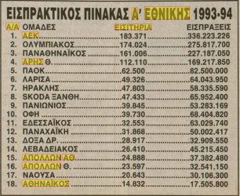 - Το 1993-1994 η Α.Ε.Κ. κατέκτησε το 3ο συνεχόμενο Πρωτάθλημα της και το 4ο από όταν ανέλαβε την τεχνική της ηγεσία ο «Πρίγκιπας του Νερέτβα» που στη συνέχεια έγινε «βάτραχος». Ο μέσος όρος τιμής εισιτηρίου -όπως προκύπτει από αυτό το δημοσίευμα αθλητικής εφημερίδας- ήταν σε Ευρώ 5,38 Ευρώ.
