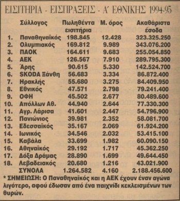 - Το 1994-1995 που η Α.Ε.Κ. δεν κατέκτησε τίποτα ο μέσος όρος τιμής εισιτηρίου διαμορφώθηκε στα 6,72 Ευρώ (βλέπε εδώ).