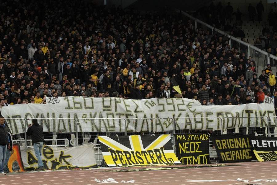 • Είναι όμως και ηλίθια αφού ακόμη και αν δεχτούμε ότι στην Α.Ε.Κ. δεν συζητάμε για πολιτική και ακόμη ότι «AEKUBERALLES», με μιά απλή ματιά στις εξέδρες του γηπέδου καταλαβαίνουμε με μιάς τον απόλυτο ταξικό δλιαχωρισμό που επικρατεί σ’ αυτό. Στο «πέταλο» κάθονται οι πληβείοι, ή οι «προλετάριοι» αν προτιμάτε. Από το βιράζ ως το άλλο «πέταλο» τα μεσαία αστικά στρώματα, αναλόγως του εισσοδήματος τους (όσο πιό κεντρικά, τόσο μεγαλύτερο το εισόδημα τους). Απέναντι τους στο κέντρο η Άρχουσα Τάξη, οι «επίσημοι», «επώνυμοι», δηλαδή οι λεφτάδες. Αφού λοιπόν όλοι αυτοί είναι μόνο Α.Ε.Κ. (και εκτός γηπέδου την χρησιμοποιούν για να κάνουν τις δουλειές τους ευκολότερα) θα ήθελα να μου εξηγήσει το «χουλιγκάνι στο πέταλο» τι κοινό μοιράζεται με αυτούς και γιατί θα πρέπει αυτός ν’ αγωνίζεται για «να περάσει ο σχεδιασμός του αφεντικού» ακριβώς όπως το «αφεντικό» θέλει. Δυστυχώς οι μόνες απαντήσεις είναι ότι είτε είναι «αφελής», είτε έχει κάποιου είδους «κέρδος» από αυτή του τη στάση.