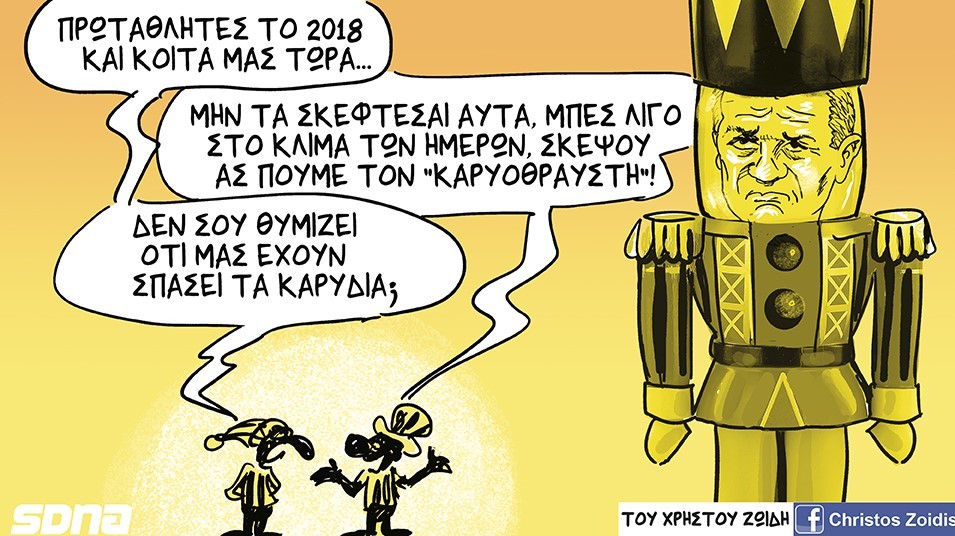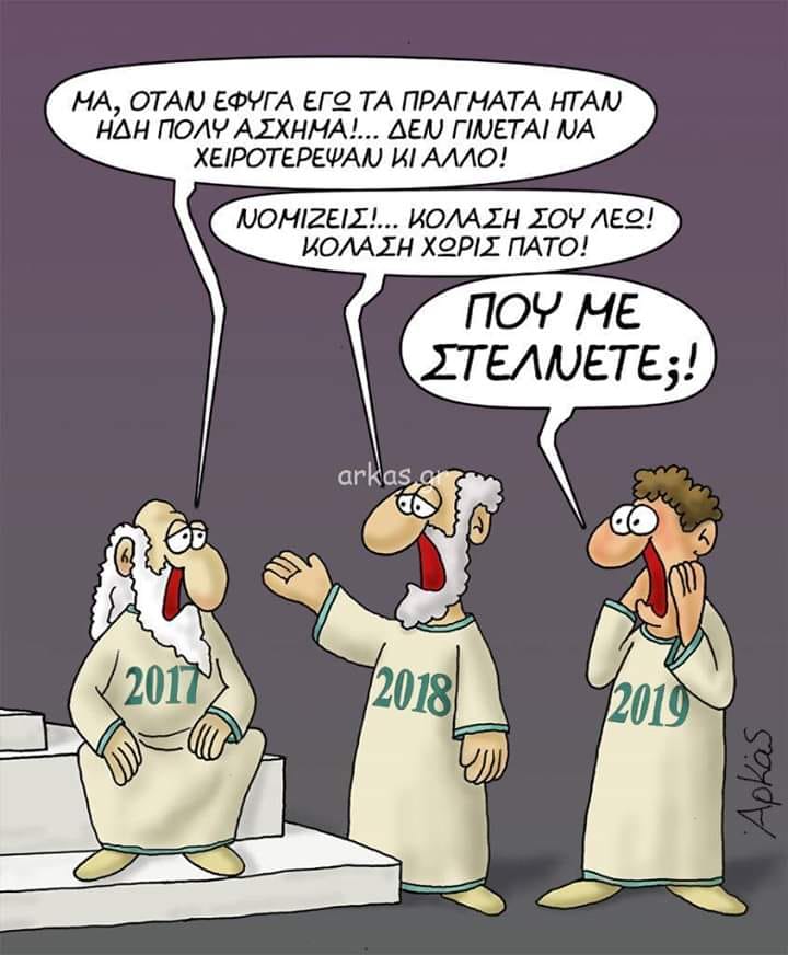 Σήμερα οι «πανταχού παρόντες» σας ευχόμαστε «ΚΑΛΗ ΧΡΟΝΙΑ» και ευτυχισμένο (όσο γίνεται) το 2019. Για τις φετινές ευχές μας διαλέξαμε 2 σκίτσα. Το ένα είναι γενικότερου ενδιαφέροντος και το δεύτερο ειδικότερου. Το πρώτο φέρει την υπογραφή του «Αρκά», ενώ το δεύτερο του Ζωίδη.