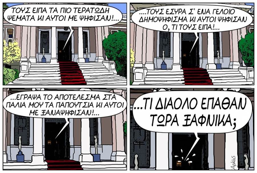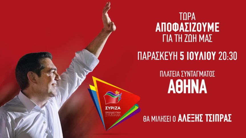 Υ.Γ. 2. Ο ΣΥ.ΡΙΖ.Α. ποτέ του δεν έφτασε πιο κοντά στην αλήθεια απ’ ότι με την αφίσα «ΑΠΟΦΑΣΙΖΟΥΜΕ ΓΙΑ ΤΗΝ ΖΩΗ ΜΑΣ». Θα ήταν τελείως αληθινό (και σωστό) αν αντί του α’ έβαζαν το γ’ πληθυντικό. «ΑΠΟΦΑΣΙΖΕΤΕ ΓΙΑ ΤΗΝ ΖΩΗ ΜΑΣ» θα ήταν το σωστό καθώς όσοι πάνε αύριο στην κάλπη αποφασίζουν για την από δω και πέρα ζωή όσων μας κυβέρνησαν.