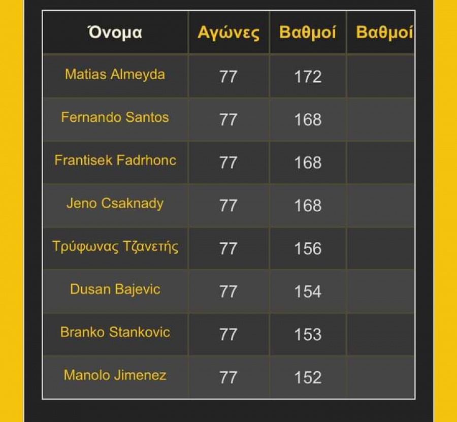 Στις 23 Σεπτέμβρη ανέβηκε στο fb η φωτογραφία από την οποία προκύπτει πως μέχρι εκείνη τη στιγμή ο Ματίας Αλμέιδα σε 77 παιχνίδια με την ομάδα ήταν ο πιο επιτυχημένος προπονητής της. Αυτό που παρατηρούμε είναι πως όλες οι στήλες (με εξαίρεση τα ονόματα) εκφράζονται με αριθμούς. Άρα είναι αντικειμενικές.