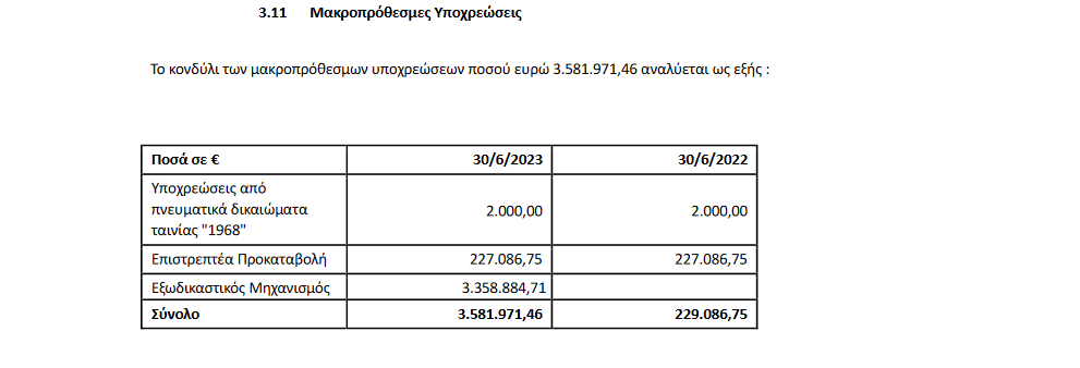 Η ενδιαφέρουσα είδηση είναι η σημείωση 3.11 του Προσαρτήματος του Ισολογισμού (βλέπε εδώ). Εδώ στο όνομα του Λογαριασμού με υπόλοιπο τα 3.581.971,46 Ευρώ διαβάζουμε «Εξωδικαστικός Μηχανισμός». Αυτή είναι και η τελευταία ελπίδα της «Βασίλισσας» όχι μόνο γιατί πήγε λίγο παραπίσω την εξόφληση του 46% των Συνολικών Χρεών της, αλλά κυρίως επειδή είναι το αποτέλεσμα μιας δεσμευτικής και για τα δύο μέρη διαδικασίας.